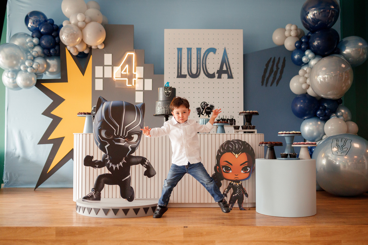 Ele já chegou falando que o Pantera Negra viria de Wakanda, que estacionaria sua nave e viria para brincar com ele e ajuda-lo na lutinha de nerf. Estava todo animado e feliz, brincando com seus amigos e correndo para todos os lados do buffet, não parou um minuto, aproveitou cada instante do seu aniversário.